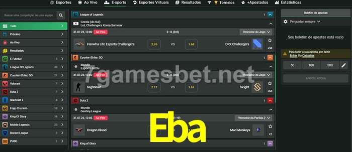 O Eba oferece uma grande seleção de opções de apostas em e-sports com probabilidades competitivas